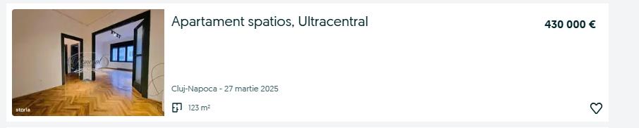 De exemplu, acest apartament cu o suprafață de 99,79 metri pătrați, situat în zona ultracentrală a municipiului Cluj-Napoca, a fost scos la vânzare pentru suma de 450.000 de euro.