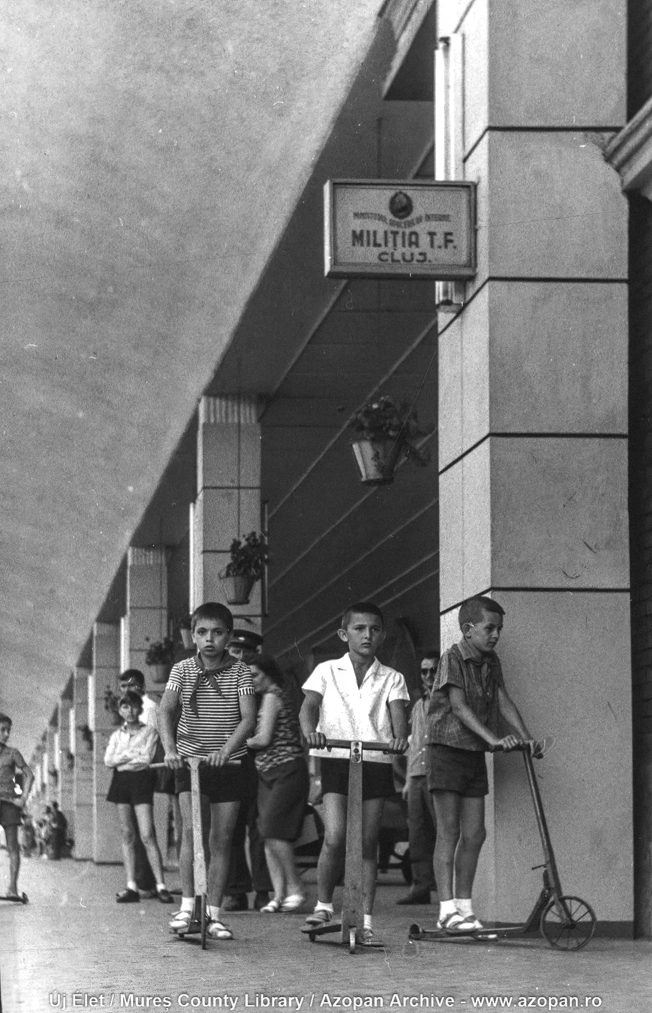 O fotografie în care apare un grup de copii pe trotinete realizată în Gara Cluj, în 1965, evocă extrem de bine vremurile de mult apuse.
