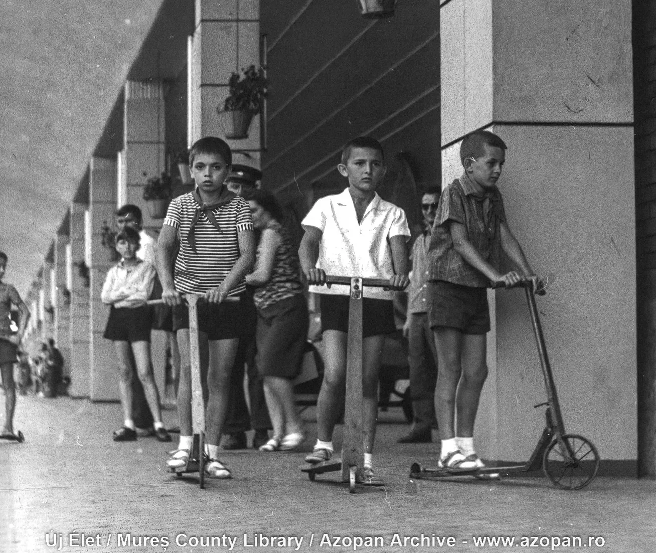 Puștii din imagine au trotinete din lemn, dar după 1980 au apărut cele din metal, mult mai trainice. Pe acele timpuri, cine avea o bicicletă sau o trotinetă era cu adevărat un norocos, iar de multe ori frații le împărțeau pentru că era imposibil pentru părinți să cumpere două.