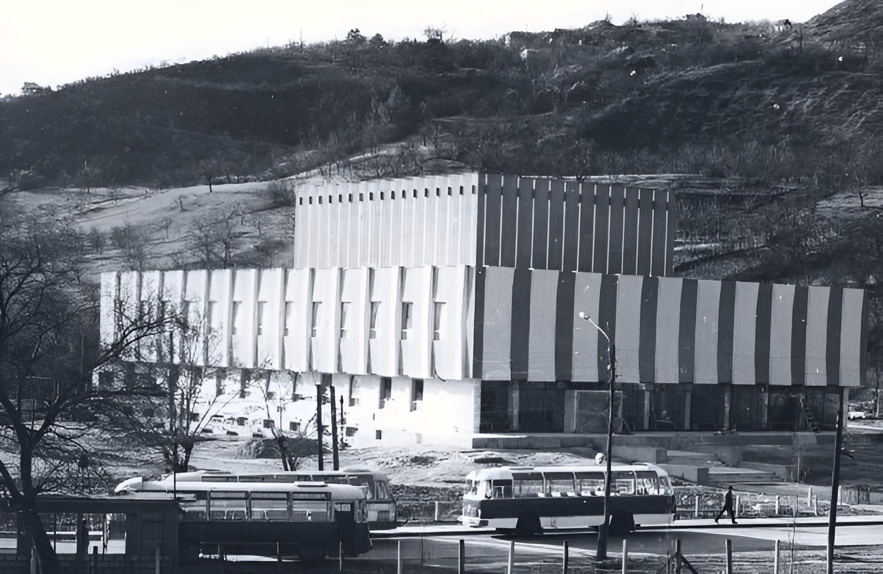 După cum se vede în fotografia de mai jos grădina nici măcar nu era amenajată încă, peisagiștii comuniști fiind încă la planșele de proiectare. A mai durat câțiva ani până când curtea să arate ca un mic parc.