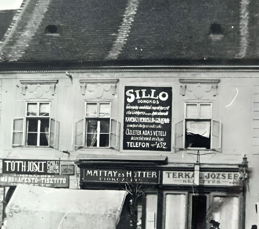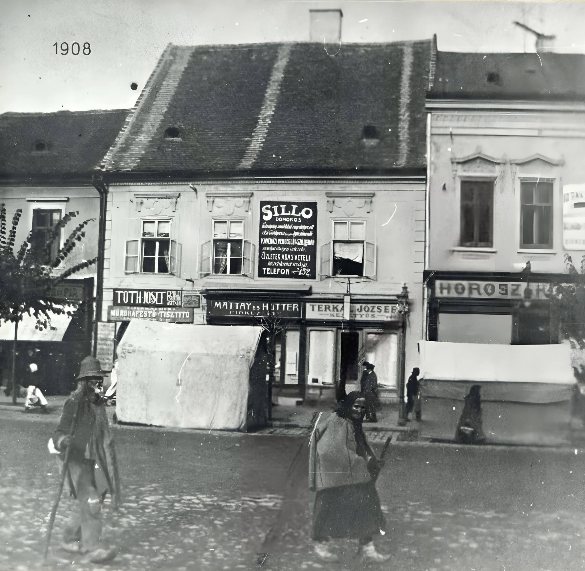 În centrul imaginii se află impunătoarea casă Rácz, o construcție de pe latura nordică a pieței, cu o istorie ce se întinde înapoi până înainte de 1522. Inițial gazdă a faimosului restaurant Rácz, această clădire avea să găzduiască ulterior restaurantul Ursus, un alt punct de referință în viața socială a orașului. În momentul fotografiei, clădirea găzduia mai multe afaceri prospere: agenția de plasare a muncitorilor Sillo, magazinul de vinuri Mattay & Hütter, un magazin de mănuși aparținând lui Terka József și atelierul de curățat-vopsit haine al lui Tóth József. Toate aceste afaceri contribuiau la efervescența comercială și socială a pieței, un centru de activitate vibrant și divers.