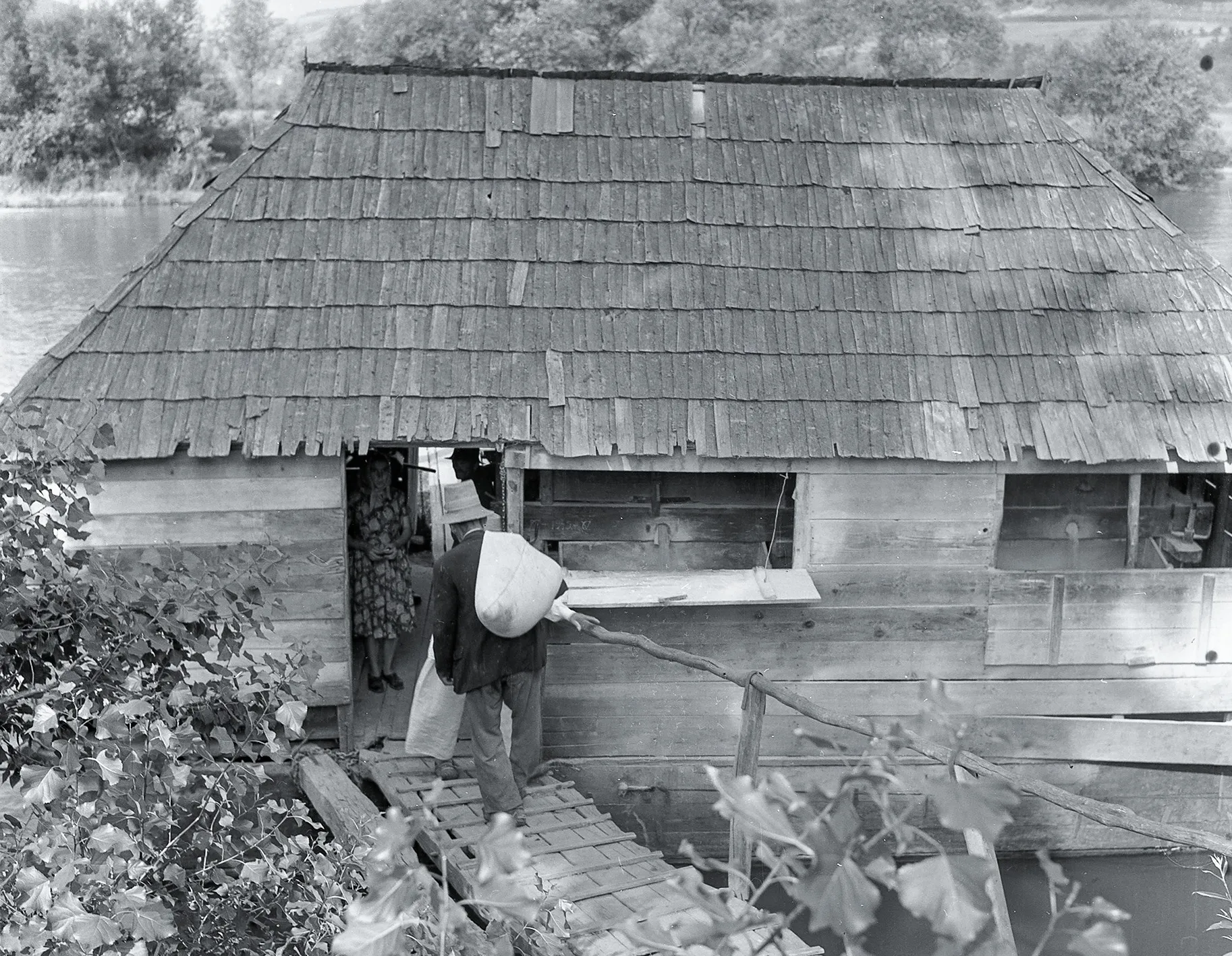 Fotografia surprinde o moară plutitoare de pe Someș, podul care duce înspre moară, balustrada făcută din lemn și un bărbat care duce pe umăr un sac de cereale.