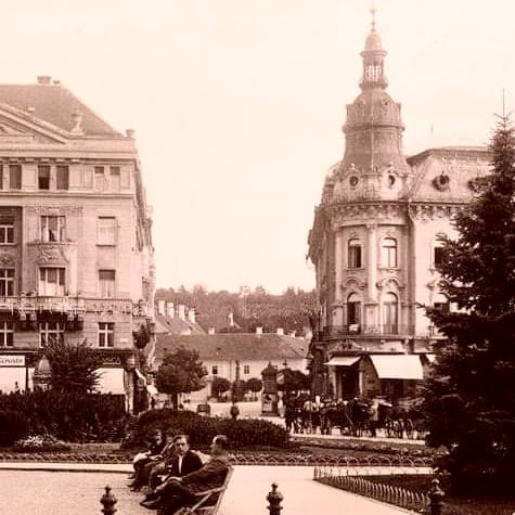 O fotografie extraordinară, surprinsă în perioada Interbelică, ne lasă să vedem cât de pitorească era Piața Unirii în acei ani. Doi domni la cosum stăteau de vorbă pe o bancă, lângă grupul statuar Matei Corvin. În fundal se vede Hotelul New York, devenit ulterior Continental. Piața Unirii era plină cu verdeață, dar și copaci, care țineau umbră în zilele toride de vară.