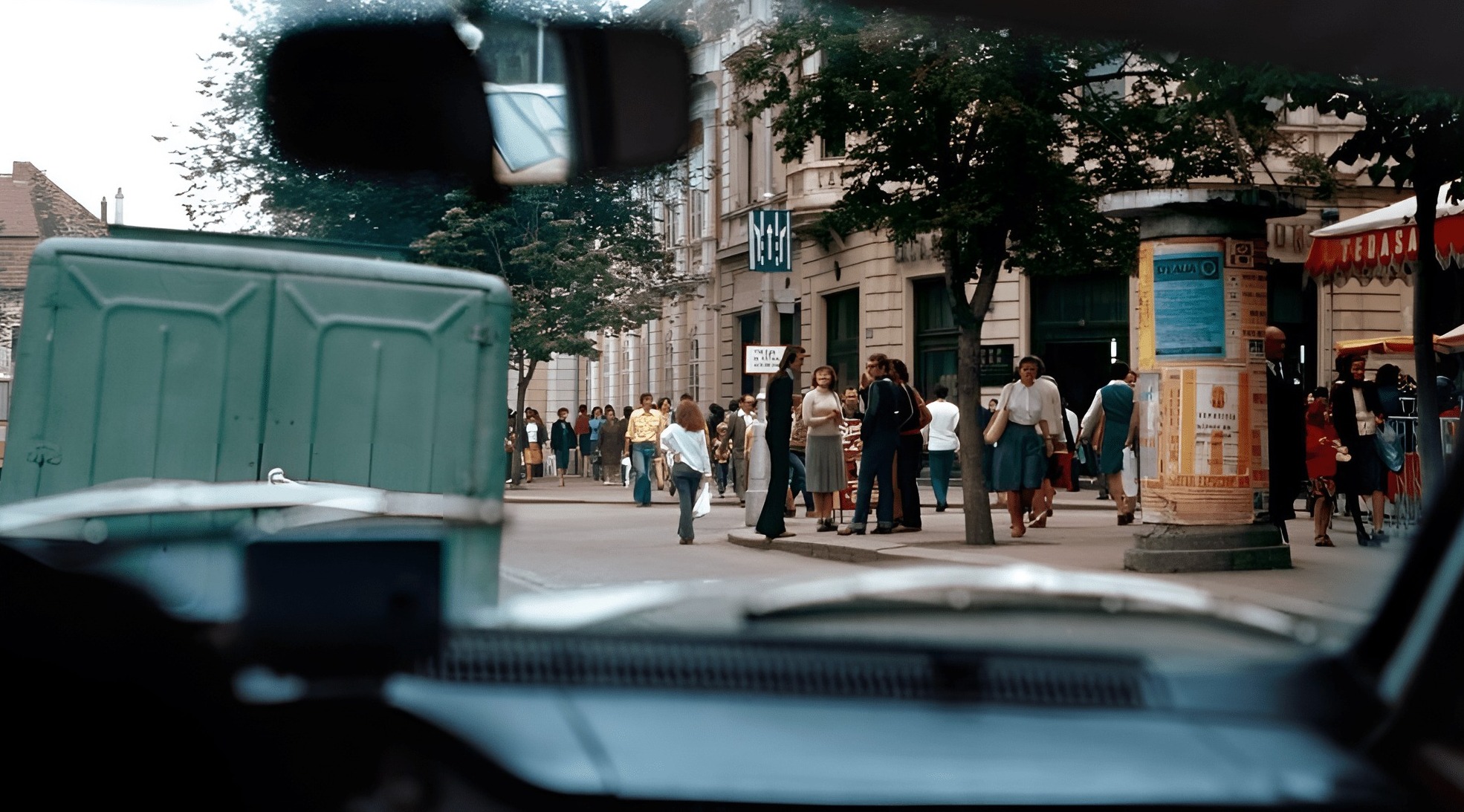 Poza a fost făcută dintr-un autoturism, la intrare spre strada Iuliu Maniu și surprinde mai mulți oameni din vremea aceea.