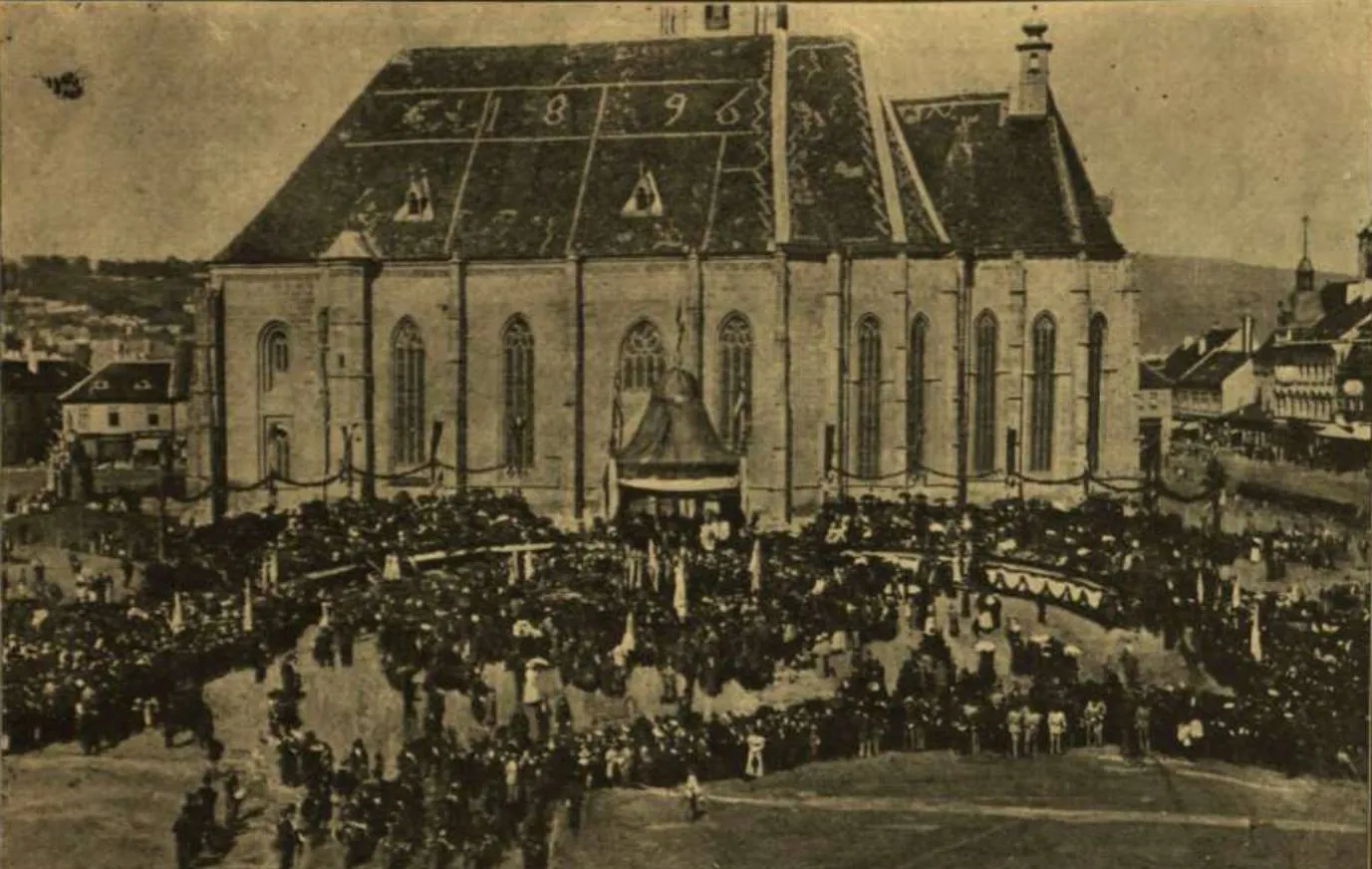Foto: Festivitati cu ocazia punerii pietrei de temelie a grupului statuar Matei Corvin in anul 1896