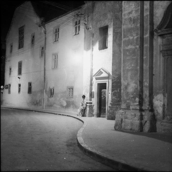 O tânără fotografiată noaptea lângă Școala de Muzică din Cluj-Napoca, în 1960, prezintă superbul Cluj de altă-dată.