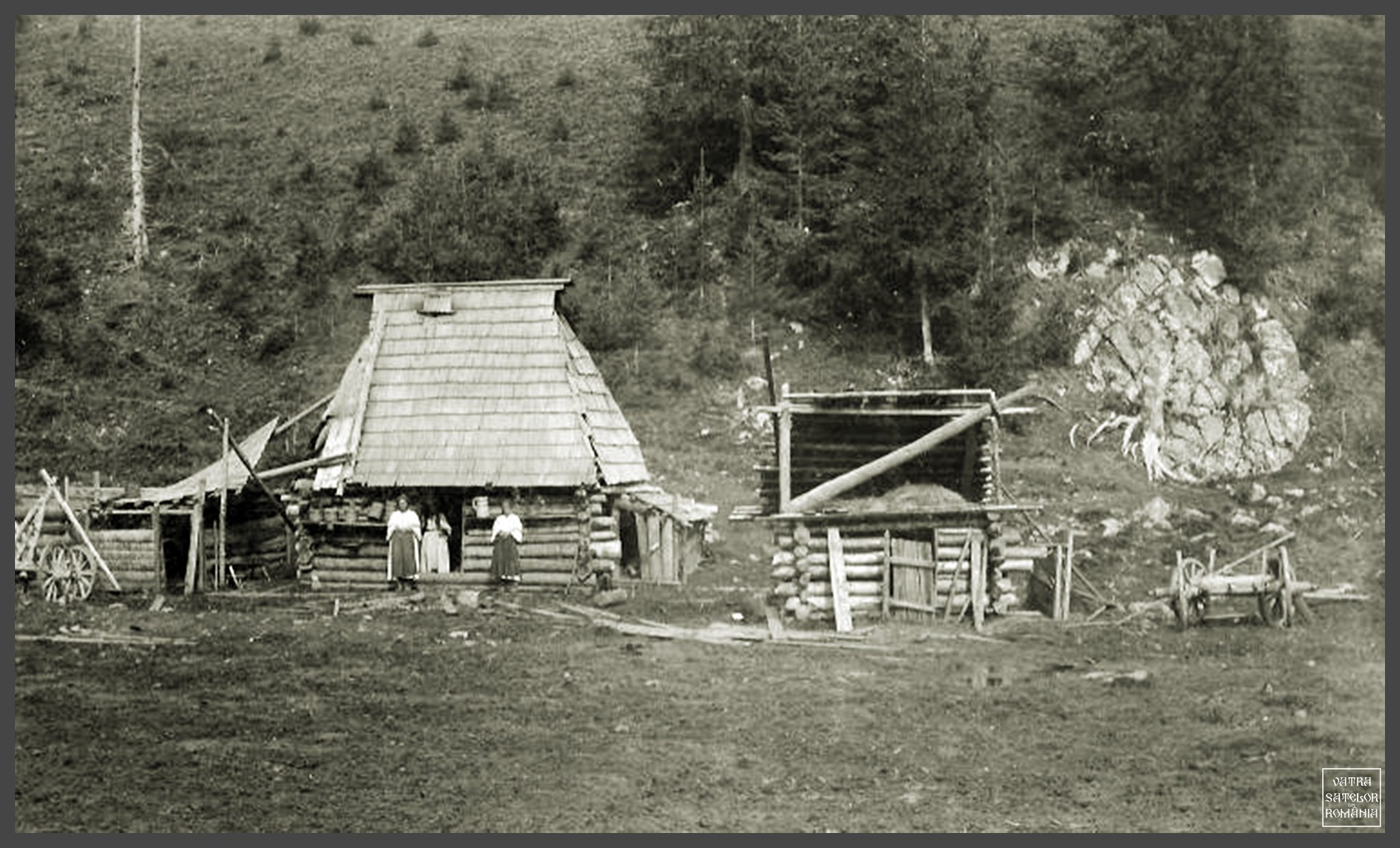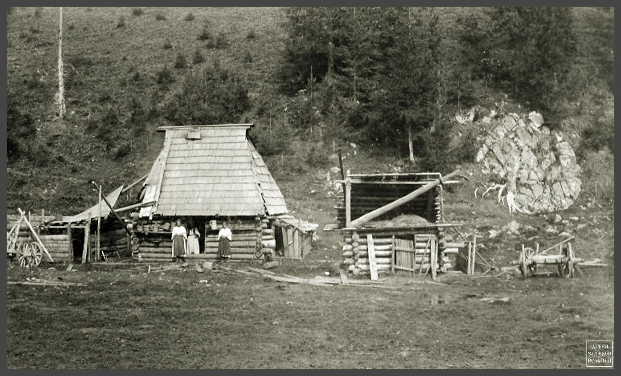 Imaginea e precum o fereastră spre viața rurală de altădată și scoate în evidență o casă autentică din lemn, acoperită cu șindrilă, construită într-un stil specific zonelor de munte. Pe prispa casei apar de trei femei îmbrăcate în straie tradiționale, care privesc spre obiectivul aparatului de fotografiat.