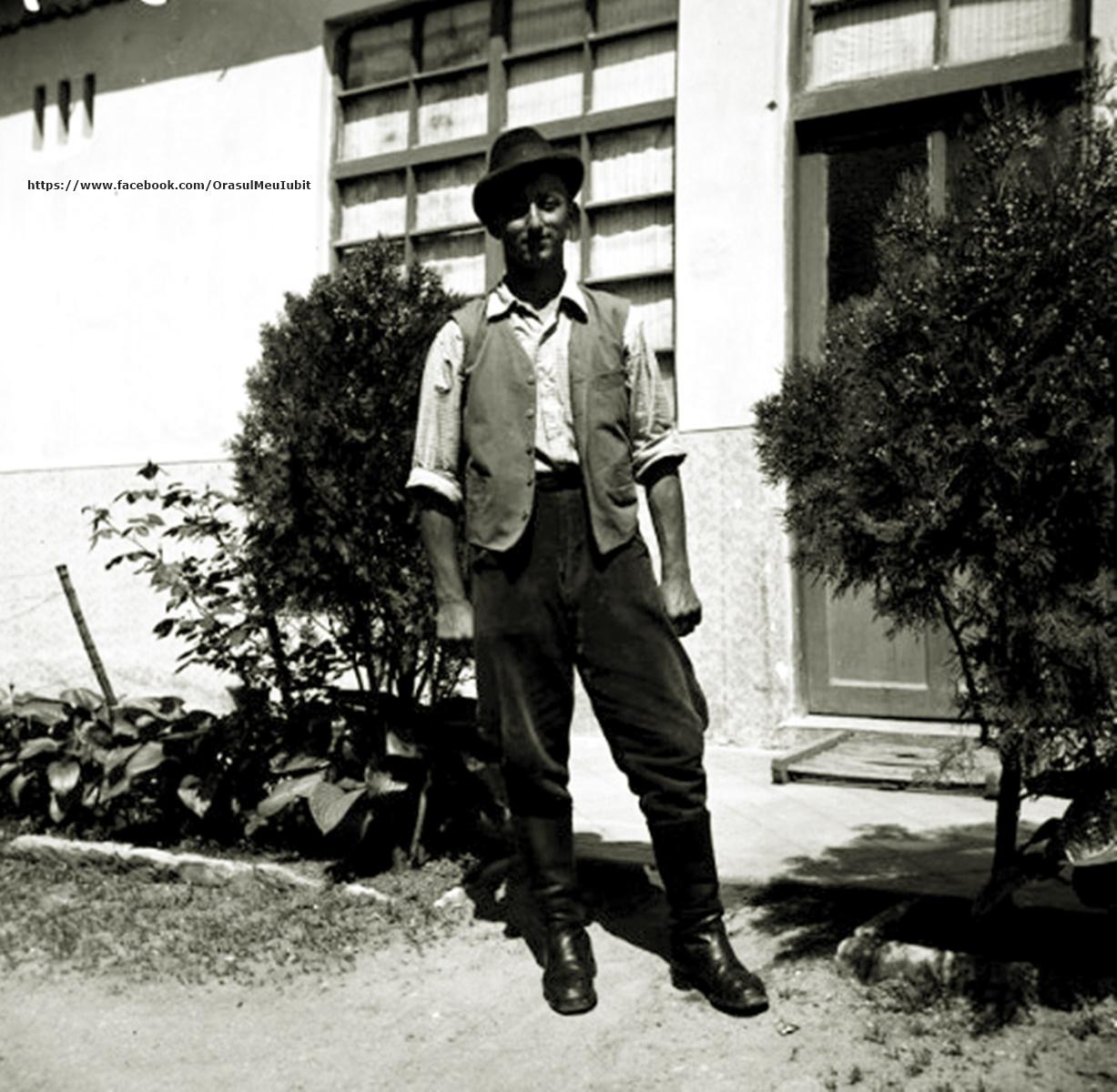 Descriere: Fecior agricultor hostezan îmbrăcat în port de lucru compus din: cămașă cu guler, pantalon bufanți stâmți la gambă pentru cizmă, vestă, pălărie, toate aceste piese fiind confecționate în mod meștesugăresc sau industrial, nu casnic, din materiale fabricate asemenea. Hostezenii sunt o comunitate de origine germană, foarte redusă numeric azi, stabilită în suburbiile nordice și estice ale cetății Cluj, în lunca Someșului, încă din sec. al XIII-lea, o populație maghiarizată, azi asimilată, de confesiune reformată. Hostezenii aveau încă din perioada modernă statutul de orășan-grădinar, preluând, în sec. al XIX-lea, în cadrul cunoștințelor agricole pe care le aveau și din tehnicile agricole de la legumicultorii bulgari stabiliți în zona Clujului.