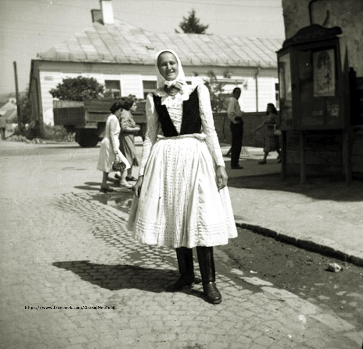 Descriere: Tânără hostezancă în port de sărbătoare fotografiată pe o stradă în mijlocului sec. al XX-lea în Hostat, un cartier mărginaș al Clujului. Portul păstrează elemente ale portului tradițional în structurarea sa, croiul și materialele din care sunt confecționate indicând apartenența la mediul citadin. Portul este compus din: năframă, cămasă cu guler cu volănașe, poale, fustă, surț plisat, vestă din catifea cusută cu motive florale alcătuite din mărgele. În fundal se pot observa două femei purtând rochiile și posetele la modă în acea vreme. De asemenea fotografia rețin și o intersecția a vechiului cartier din estul Clujului în care au locuit hoștezenii. Aceștia sunt o comunitate de origine germană, foarte redusă numeric azi, stabilită în suburbiile nordice și estice ale cetății Cluj, în lunca Someșului, încă din sec. al XIII-lea, o populație maghiarizată, azi asimilată, de confesiune reformată. Hostezenii aveau încă din perioada modernă statutul de orășan-grădinar, preluând, în sec. al XIX-lea, în cadrul cunoștințelor agricole pe care le aveau și din tehnicile agricole de la legumicultorii bulgari stabiliți în zona Clujului.