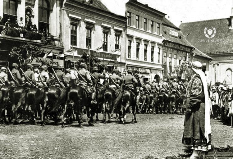 O fotografie de epocă ce o înfățișează pe regina Maria alături de o manifestație a cavaleriei în timpul turneului regal din Transilvania, în Cluj, în Piața Unirii la 1919. Imaginea a fost surprinsă de renumitul fotograf de război Merl La Voy.