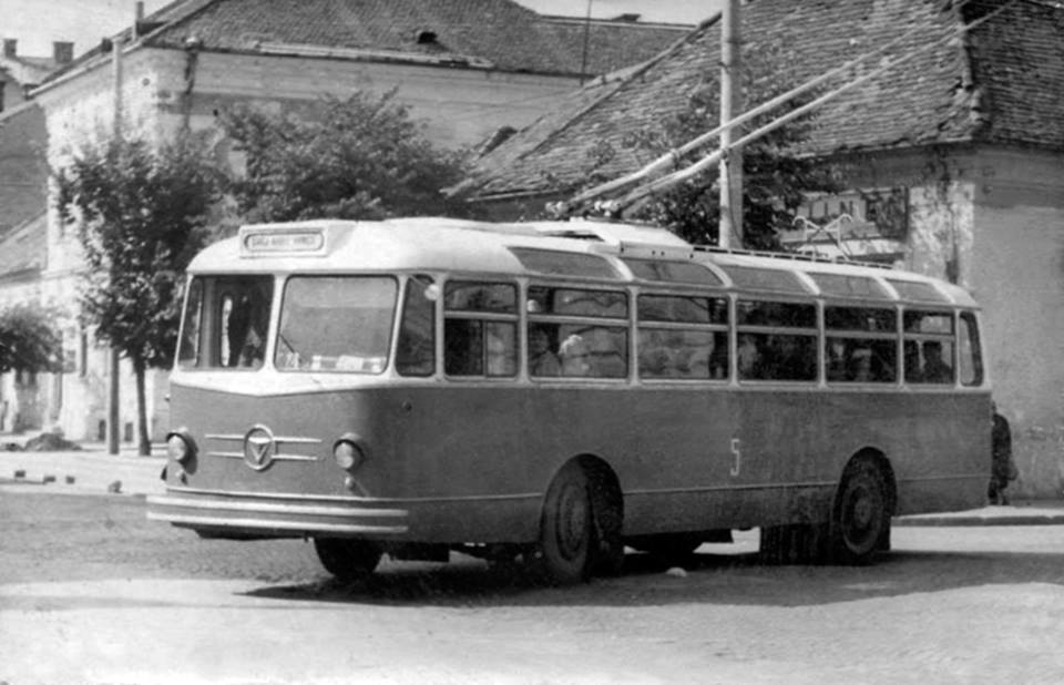 Într-o fotografie se vede un troleibuz vechi, care lega Gara Cluj de centrul orașului.