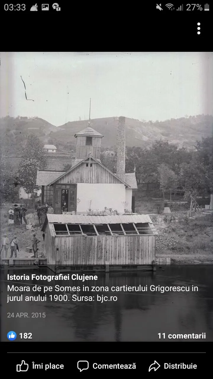 Una dintre morile ce au funcționat in orașul nostru, asa cum menționează " Istoria Fotografiei Clujene". A mai fost una aproape de Astoria tot pe Someș, una pe Canalul Morii, Baritiu cu Doja, si inca una tot pe Canalul Morii, în fostul Hostat, pe Buftea.