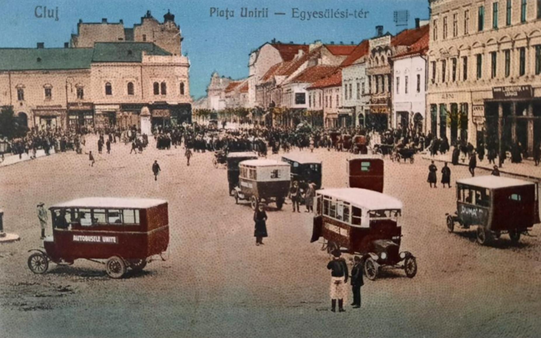 Locul nu este altul decât – „Piața Unirii, iar fotografia este marcată și în maghiară, semn al diversității culturale de sute de ani a orașului Cluj.