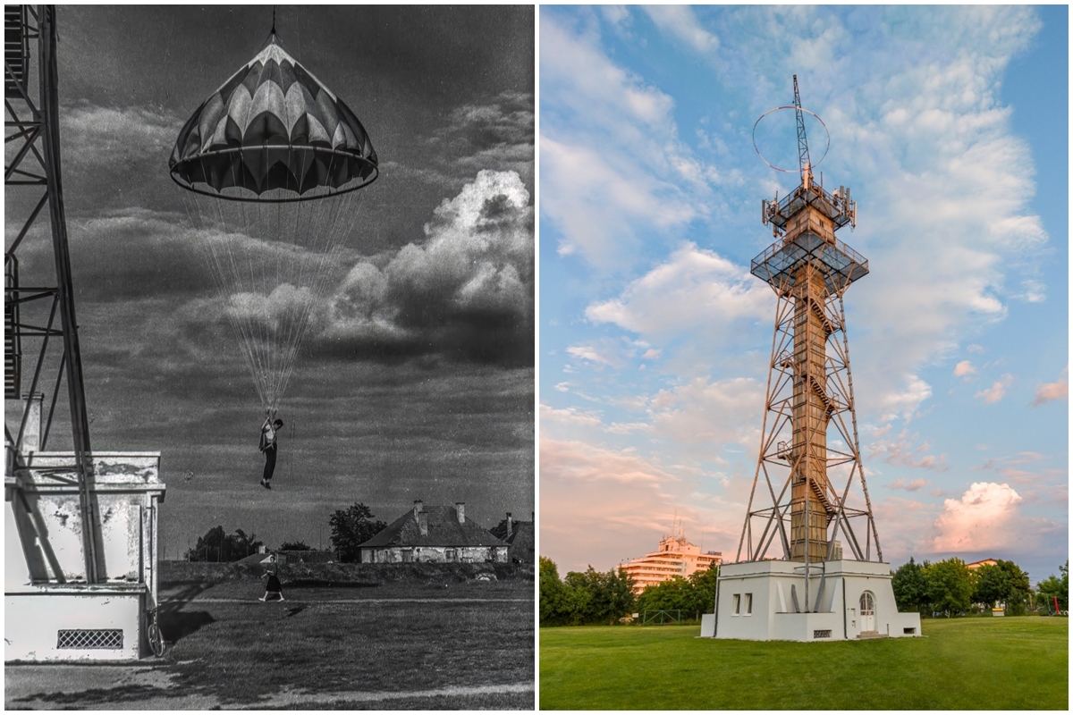 Săritură din turnul parașutiștilor din Cluj, surprinsă acum 60 de ani! Fotografia este parte din patrimoniul fotografic al României