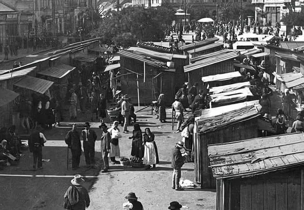 Oameni simpli, îmbrăcați elegant și cu bun gust, sunt siluetele care se pot observa într-o poză din Piața Mihai Viteazul din anul 1938, alături de diferite tarabe construite din lemn și tablă.