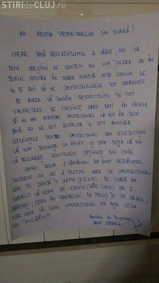 ”Proprietarii de locuințe care dați an chirie să nu mai aceptați omosecsuali la noi ân bloc. Dacă nu ne veți respecta și veți ânchiria locuințele pentru omosecsuali sau legebitiști vă vom denunța la ANAF și știm că deja nu vă declarați veniturile opținute din chiri”, se arată în scrisoare.
