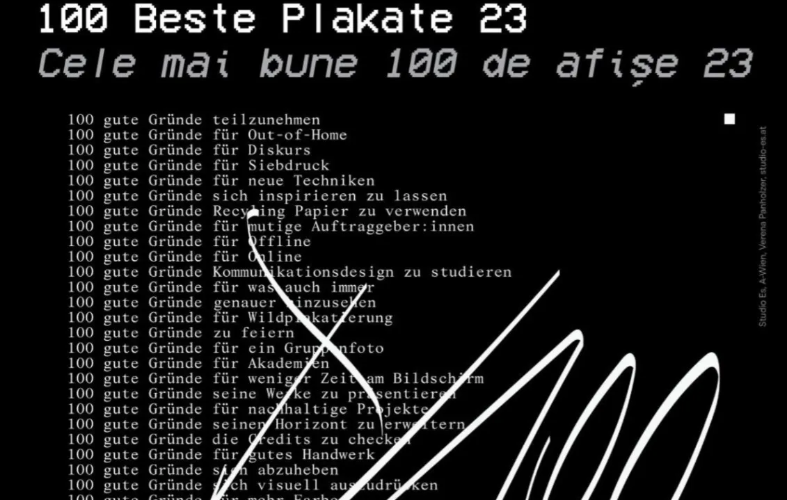 Centrul Cultural German din Cluj-Napoca, în parteneriat cu Asociația 100 Beste Plakate e.V. și Muzeul de Artă Cluj-Napoca, aduce în fața publicului o nouă ediție a uneia dintre cele mai prestigioase competiții de design grafic din Europa: „100 Beste Plakate 23 // Cele mai bune 100 de afișe 23”. Expoziția poate fi vizitată între 13 și 29 noiembrie 2025, la Muzeul de Artă Cluj-Napoca (Palatul Bánffy, Piața Unirii nr. 30).