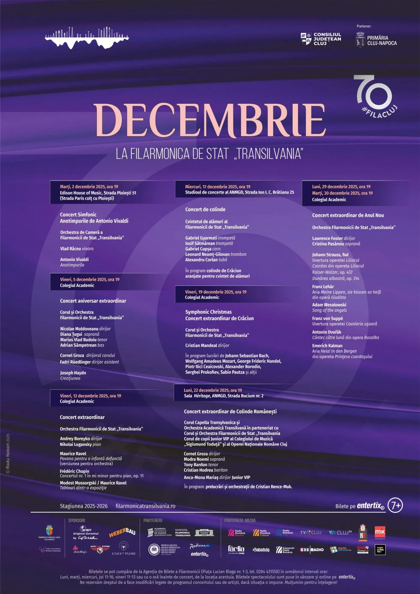 Filarmonica de Stat „Transilvania” pregătește pentru luna decembrie 2025 o serie impresionantă de concerte, menite să aducă publicului clujean magia sărbătorilor de iarnă și strălucirea muzicii clasice. Programul variat include atât capodopere baroce, cât și lucrări romantice, creații moderne, precum și tradiționalele concerte de colinde și mult așteptatul concert de Anul Nou.