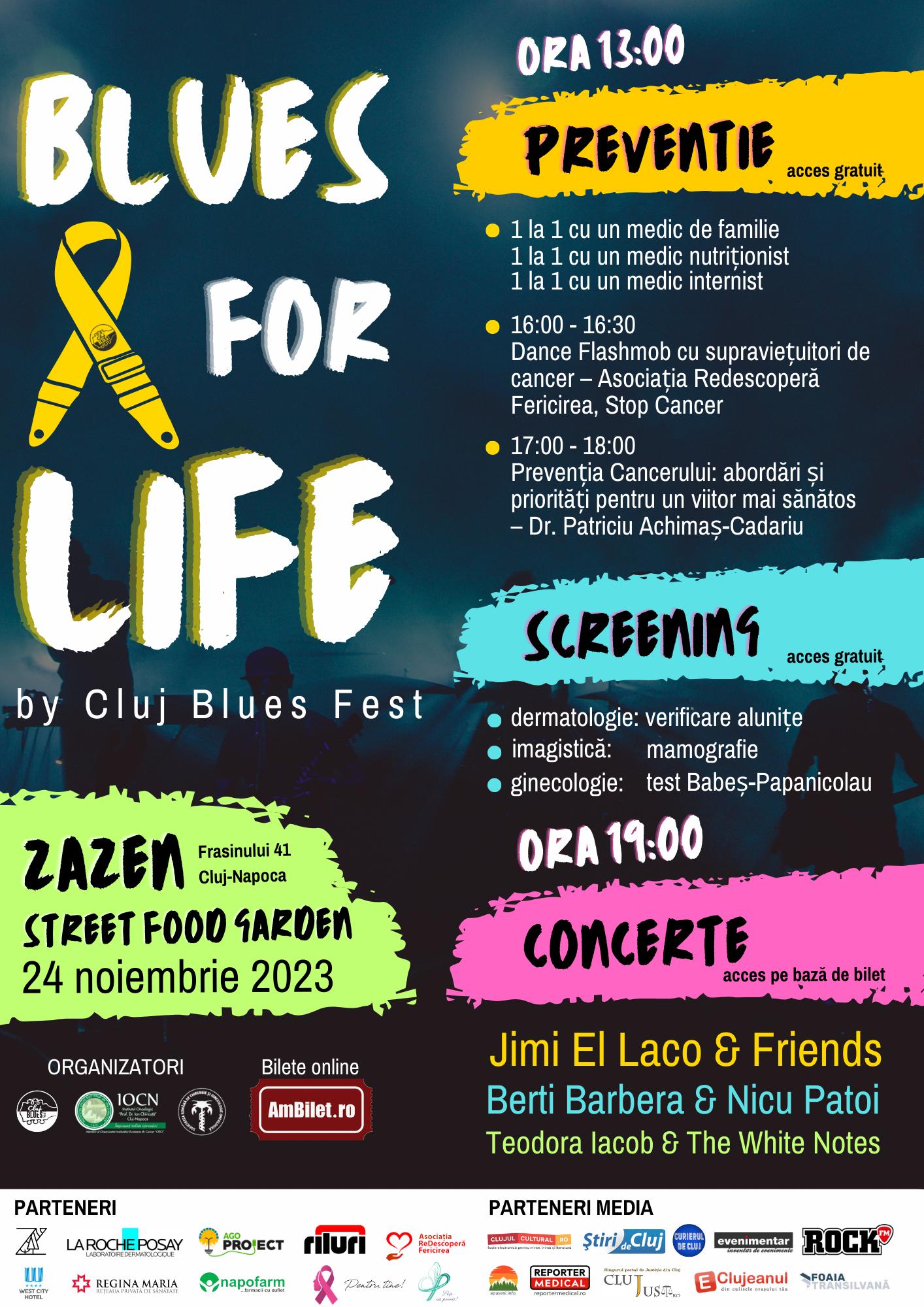 Evenimentul ”Blue for Life by Cluj Blues Fest” propune vineri, 24 noiembrie, în incinta Zazen (str. Frasinului nr. 41), o serie de activități dedicate prevenției cancerului, cu intrare liberă, dar și trei concerte de cea mai bună calitate oferite de trupe cu mare experiență pe scena muzicală.