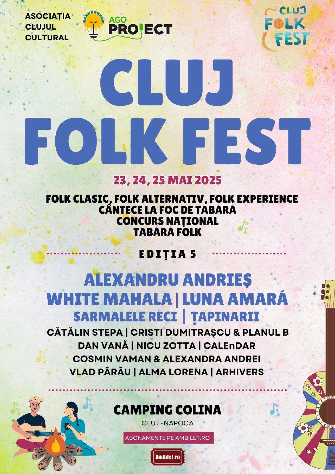 Cluj-Napoca devine capitala folkului românesc între 23 și 25 mai 2025, când are loc cea de-a cincea ediție a Cluj Folk Fest! Evenimentul, devenit deja tradiție, promite un weekend plin de muzică live, emoție și conexiune autentică în natură, în decorul pitoresc al Colina Secret Garden (Camping Colina), la marginea cartierului Mănăștur.