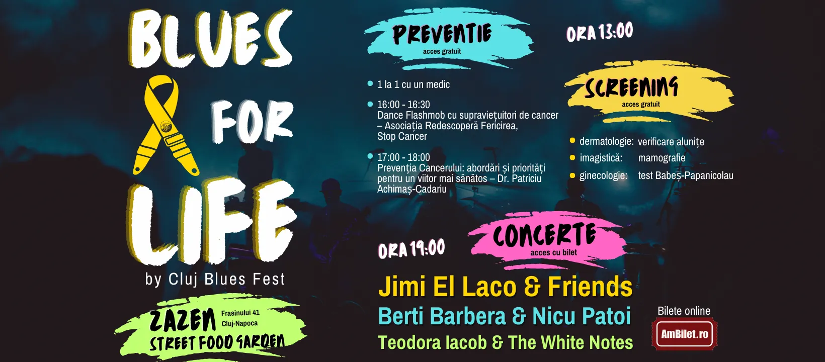 Clujenii sunt așteptați vineri, 24 noiembrie, la ZAZEN (strada Frasinului nr. 41), la un eveniment dedicat prevenției și screening-ului oncologic. Blues for Life by Cluj Blues Fest este organizat de Cluj Blues Fest, în colaborare cu Institutul Oncologic „Prof. Dr. Ion Chiricuță” și Societatea Română de Chirurgie și Ginecologie Oncologică.