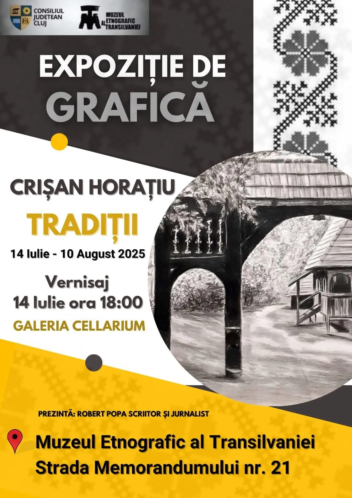 Muzeul Etnografic al Transilvaniei, instituție publică de cultură aflată în subordinea Consiliului Județean Cluj, invită publicul să descopere expoziția de grafică „Tradiții”, semnată de artistul Horațiu Crișan. Aceasta va fi deschisă în perioada 14 iulie - 10 august 2025, în Galeria Cellarium a muzeului, situat pe strada Memorandumului nr. 21.