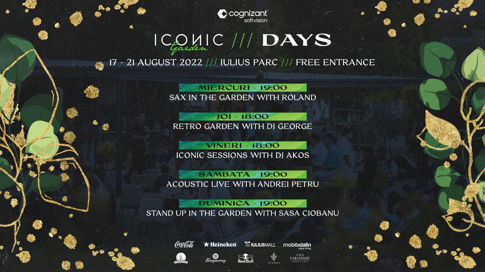Sunetele armonioase ale saxofonului se vor auzi miercuri în Iconic Garden din Iulius Parc, de la ora 19.00, atunci când începe seara tematică „Sax in the garden cu Roland”. Iar dacă ești o fire nostalgică, joi, de la ora 18.00, primești invitație la Retro Garden cu DJ George. Vineri, muzica din Iconic Garden prinde mai mult ritm și dă tonul pentru și mai multă distracție, ca de final de săptămână, pentru că de la ora 18.00 dansezi pe Iconic Sessions cu Dj Akos. Sâmbătă, de la ora 19.00, pe scena din grădina urbană va urca Andrei Petru și a sa chitară, abordând genuri blues, jazz și funk, cu piese proprii și reinterpretări, într-un live session. În ultima seara, comedia este la ea acasă în Iulius Parc. Duminică, de la ora 19.00, vei râde de glumele lui Sașa Ciobanu, finalist al show-ului TV de profil Stand-Up Revolution.