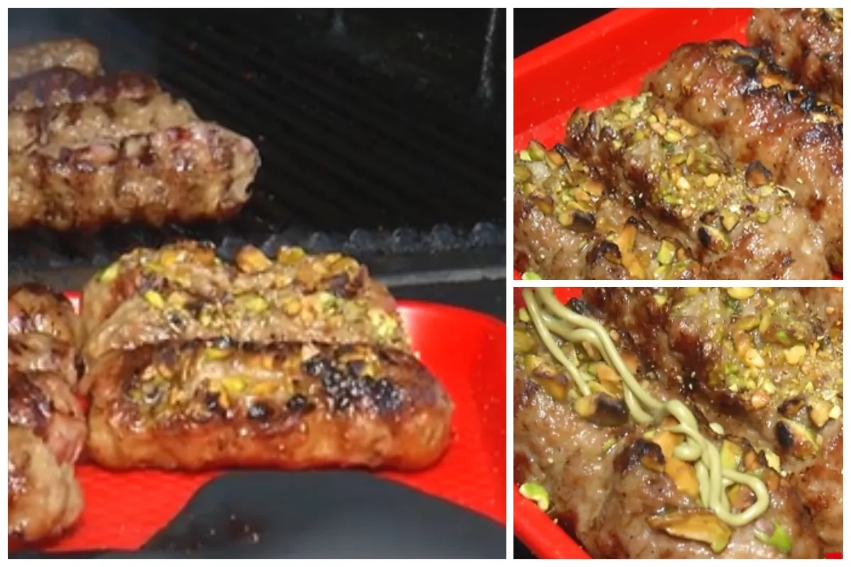 Proprietarul unui restaurant de mici a explicat și rețeta. Mititeii sunt umpluți cu bucăți de fistic, după care sunt prăjiți pe grătar. La final, vin acoperiți cu o infuzie de cremă de fistic.