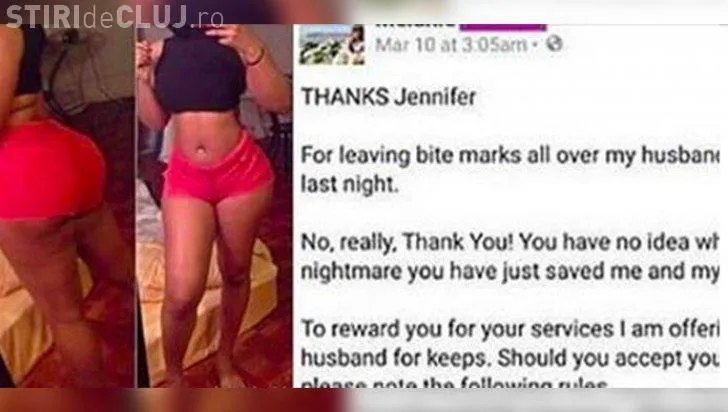 ”Îţi mulţumesc că ai lăsat semne de muşcătură pe gâtul soţului meu. Asta mi-a confirmat că are o amantă. În semn de recunoştinţă, ţi-l las pentru totdeauna. Totuşi, trebuie să ştii: va trebui să-l ajuţi financiar, întrucât le va plăti pensie alimentară celor 2 copii ai mei. Va trebui să renunţi la el în fiecare week-end, atunci când va sta cu cei mici. Viaţa voastră sexuală va suferi, deoarece în urma unui accident în urmă cu 4 ani, fostul meu soţ nu poate "presta" aşa cum trebuie. Nu poţi să mi-l returnezi, nu-l primesc înapoi”, este mesajul postat de femeia înșelată pe contul de Facebook al amantei.