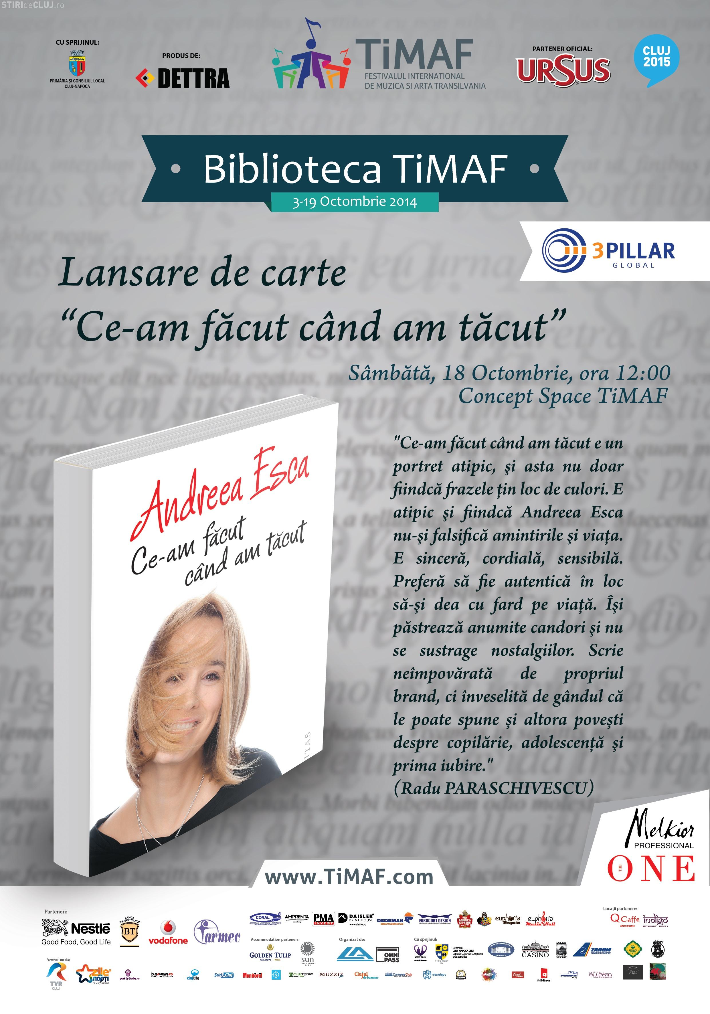 Tot pe 18 octombrie, Festivalul Internaţional de Muzică şi Artă Transilvania invită publicul la evenimentul de lansare a cărţii “Ce am făcut când am tăcut” scrisă de Andreea Esca. Evenimentul va avea loc în cortul TiMAF amplasat pe Bulevardul Eroilor, în prezenţa autoarei, urmat de o sesiune de autografe.