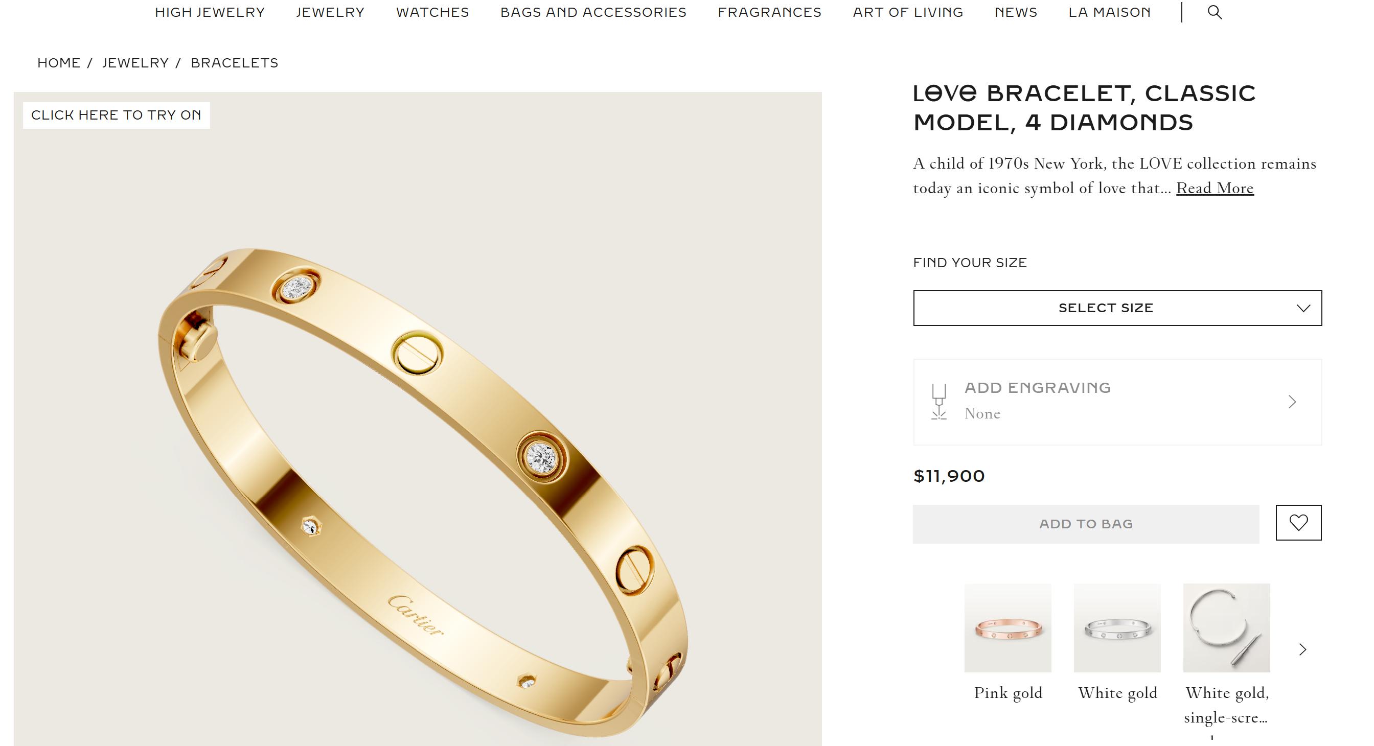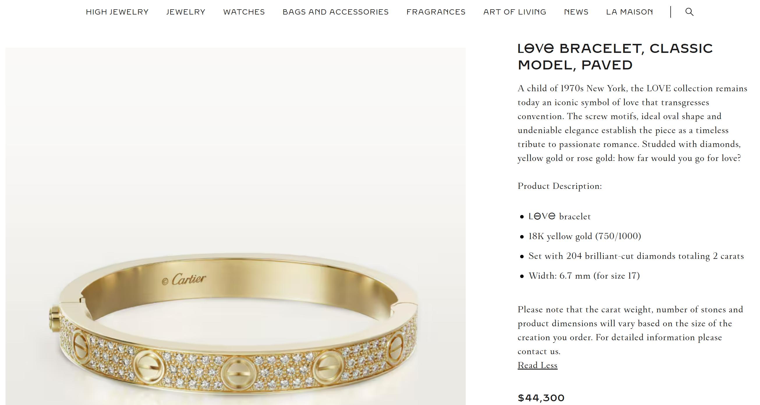 De exemplu, această brățara se numește Love Bracelet și este deja destul de greu de găsit, căci s-a vândut foarte bine, deși prețul este între 8000 și 11.000 de dolari, dacă are 4 diamante. Cartier Love Bracelet Wider Model e fabricată din aur de 18k 750/1000. Modelul a fost creat la New York în 1969. Brățara LOVE este un simbol al designului de bijuterii: o brățară adaptată corpului, compusă din arcuri rigide care se poartă pe încheietura mâinii și se îndepărtează folosind o șurubelniță specială. Închizătoarea este proiectată cu două șuruburi funcționale plasate pe fiecare parte a brățării.