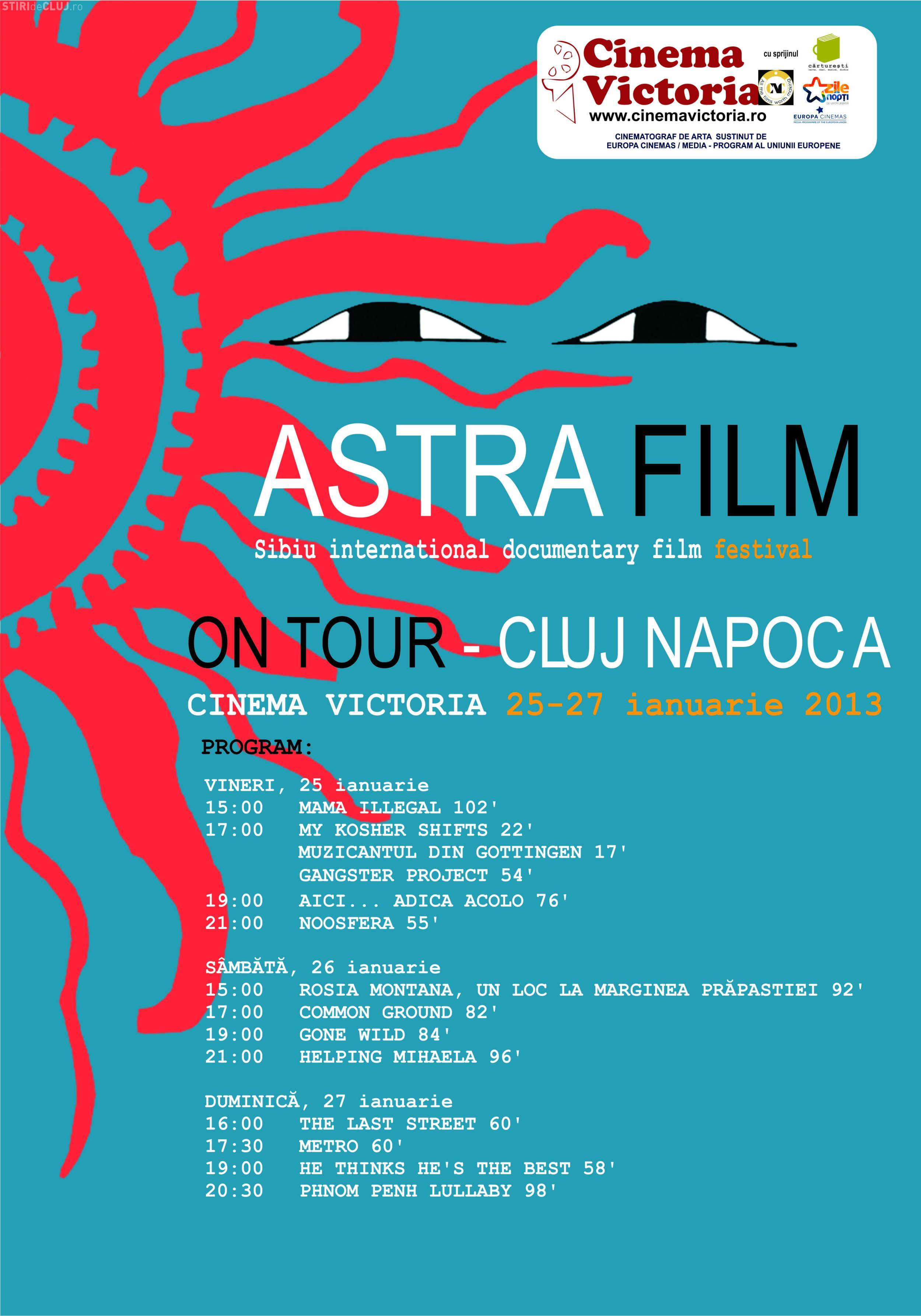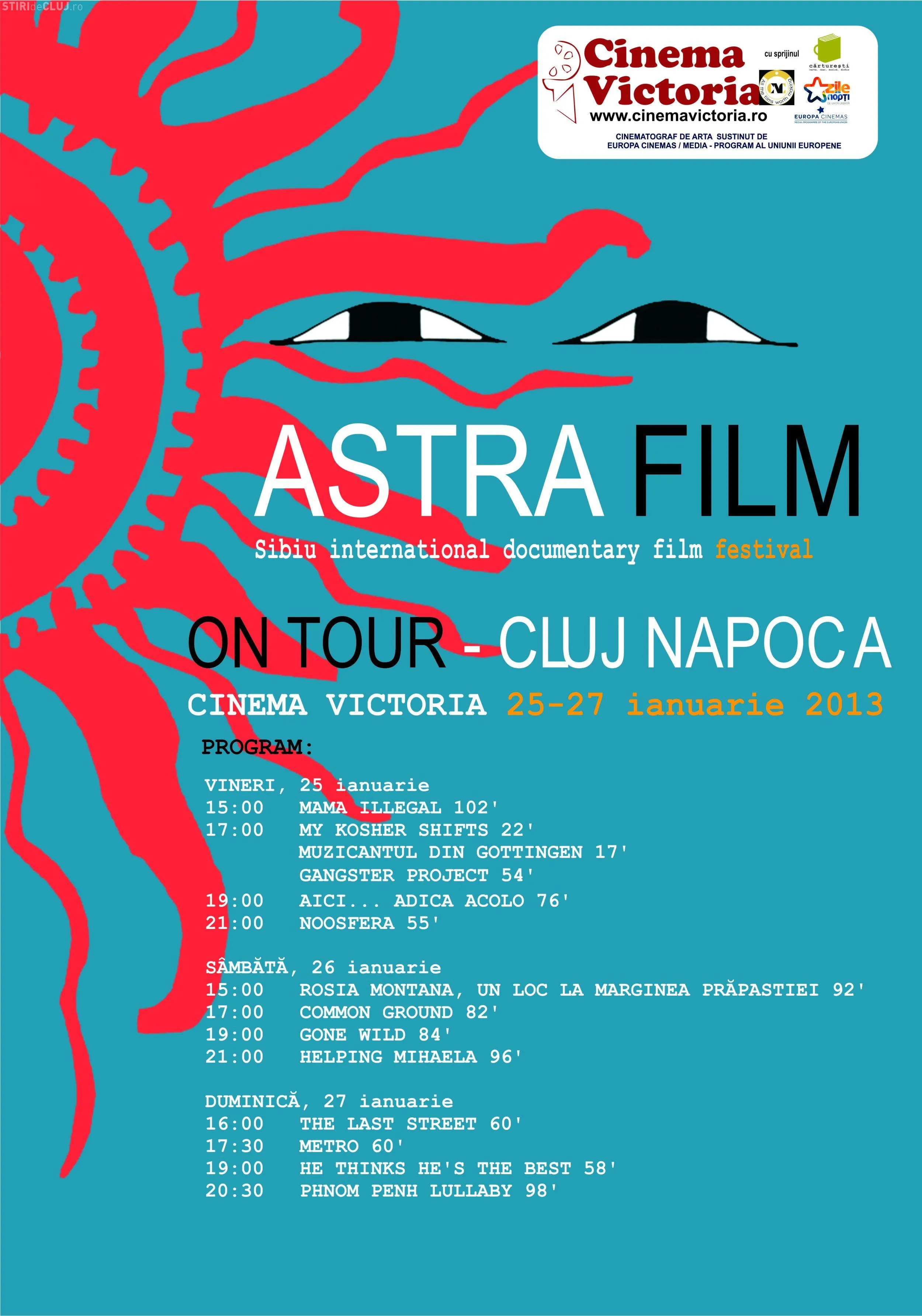 Prestigiosul festival de documentare Astra Film ajunge la Cluj-Napoca la sfârșitul acestei săptămâni, pentru a le prezenta cinefililor clujeni 14 filme documentare de excepție, românești și străine, din selecția ediției 2012. Astra Film Festival (AFF) este cel mai vechi festival internațional din România, fiind înființat la începutul anilor 1990. Proiecțiile de la Cluj vor rula la Cinema Victoria de vineri până duminică (25 – 27 ianuarie).