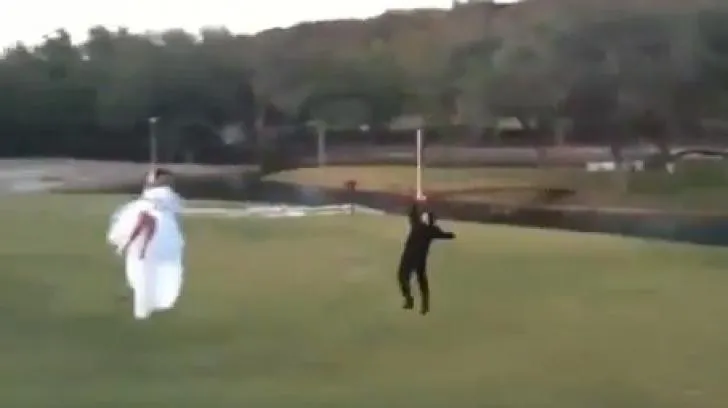 Mirii s-au urcat pe tiroliană pentru a traversa un râu. Intrarea la nuntă trebui să fie spectaculoasă, dat mirele a prins viteză prea mare și s-a lovit de partenera lui de viață.