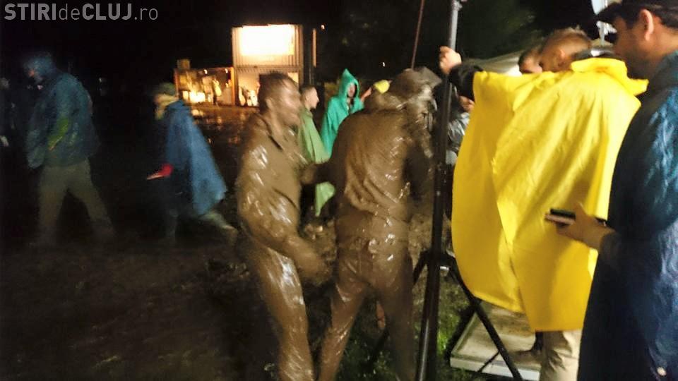 Mai mulți tineri au luat în glumă noroiul de la Electric Castle, care afectează serios festivalul din acest an, și s-au bucurat cum au putut.