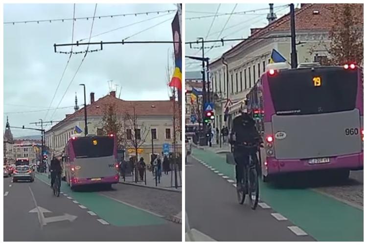 Un șofer a avut o surpriză în trafic, pe o stradă din centrul Clujului. Acesta se afla pe strada Regele Ferdinand joi dimineața, moment în care a observat un biciclist.