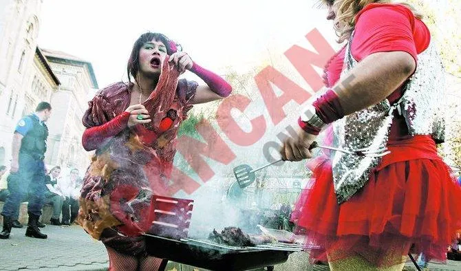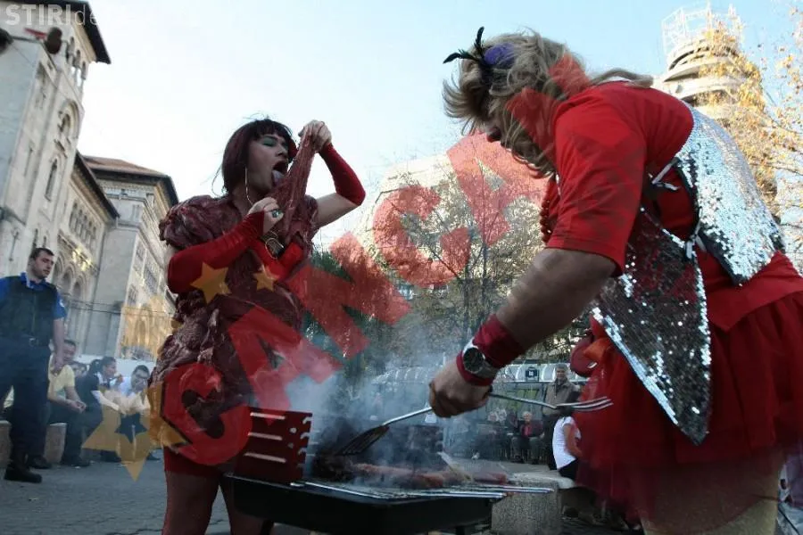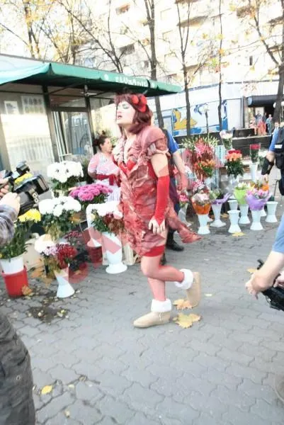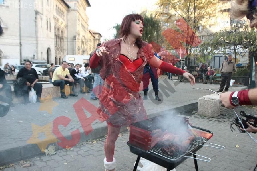 Mihai Bendeac a iesit la plimbare prin Bucuresti intr-o rochie a la Lady Gaga, din carne cruda pe care a prajit-o la gratar.