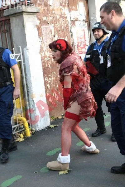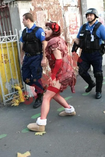 Pe langa rochia din carne cruda, "Naomi" a mai purtat ciorapi rosii de dama si portjartier. Bucurestenii au fost socati de intalnirea de gradul 3.