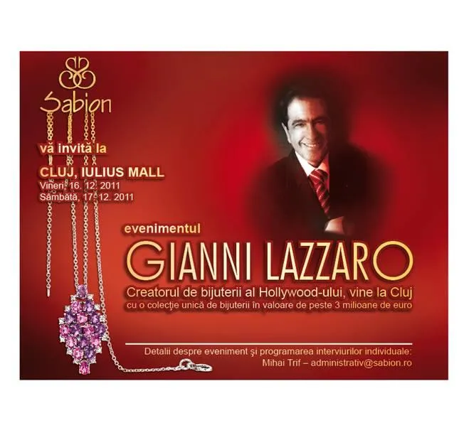 Creatorul de bijuterii al Hollywood-ului, Gianni Lazzaro, isi va aduce colectia impresionanta la Cluj intr-un eveniment organizat in galeria Sabion din Iulius Mall.