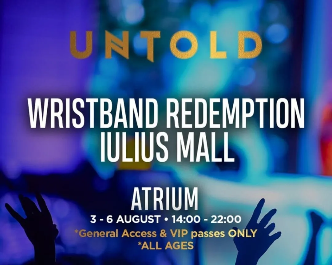 Dorința de a ne distra alături de prieteni sau familie, plăcerea de a asculta muzică și pura bucurie de a vedea live artistul preferat ne readuc împreună la unul dintre cele mai așteptate festivaluri din România. O nouă ediție UNTOLD se pregătește să înceapă, iar Iulius Mall Cluj devine punctul de întâlnire al festivalierilor, care merg să îi vadă pe artiștii momentului. Standul de ridicare al brățării, Wristband Pick-up, este și în acest an în Atriumul Iulius Mall, zona Zara. Te așteptăm în perioada 3-6 august 2024, în intervalul orar 14.00 – 22.00! Taxa de 25 de lei pentru brățară se achită la standul din Atrium.