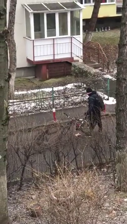 Biciclistul a încercat să treacă, dar câinele Petrică a sărit direct la cauciuc.