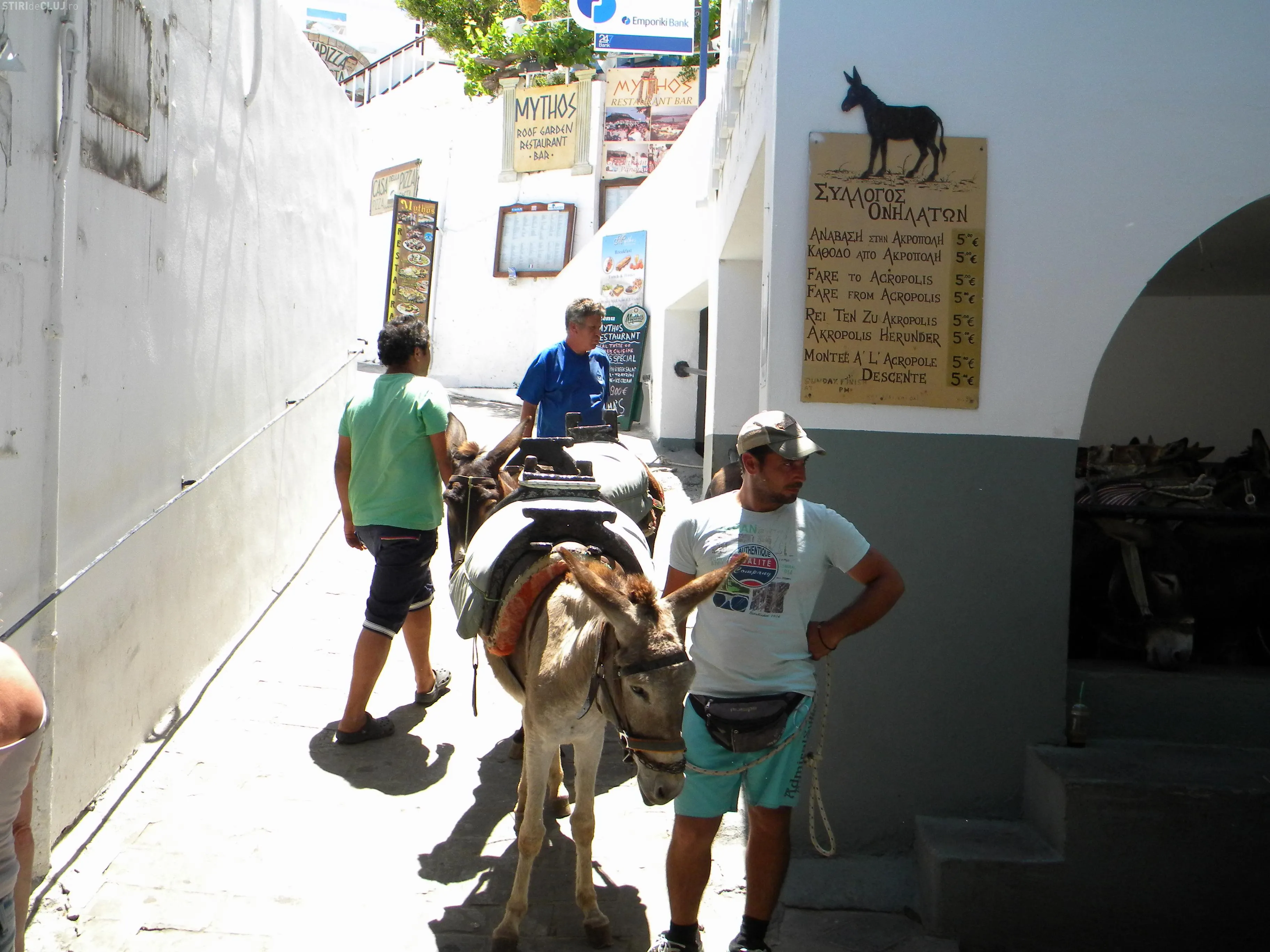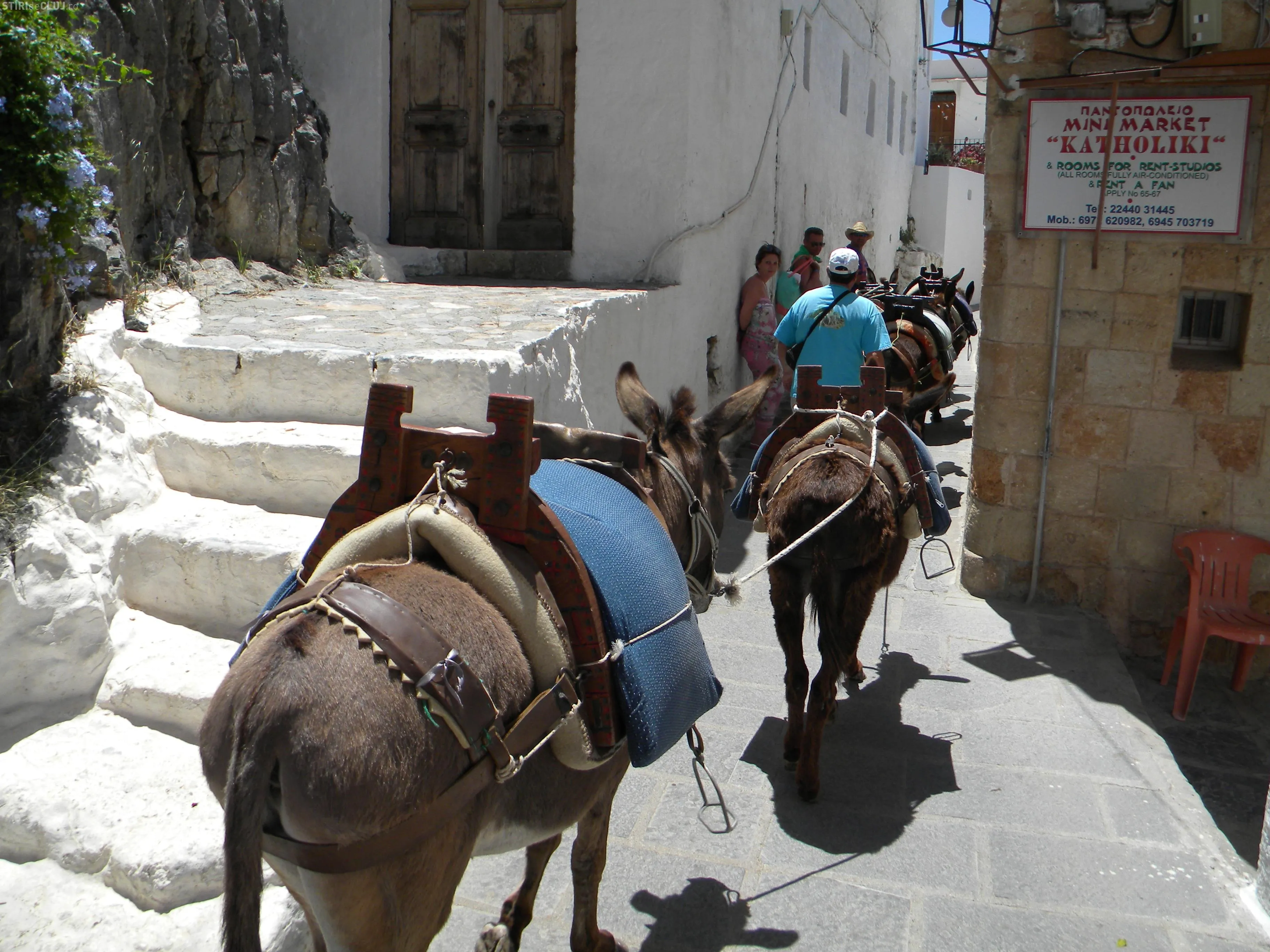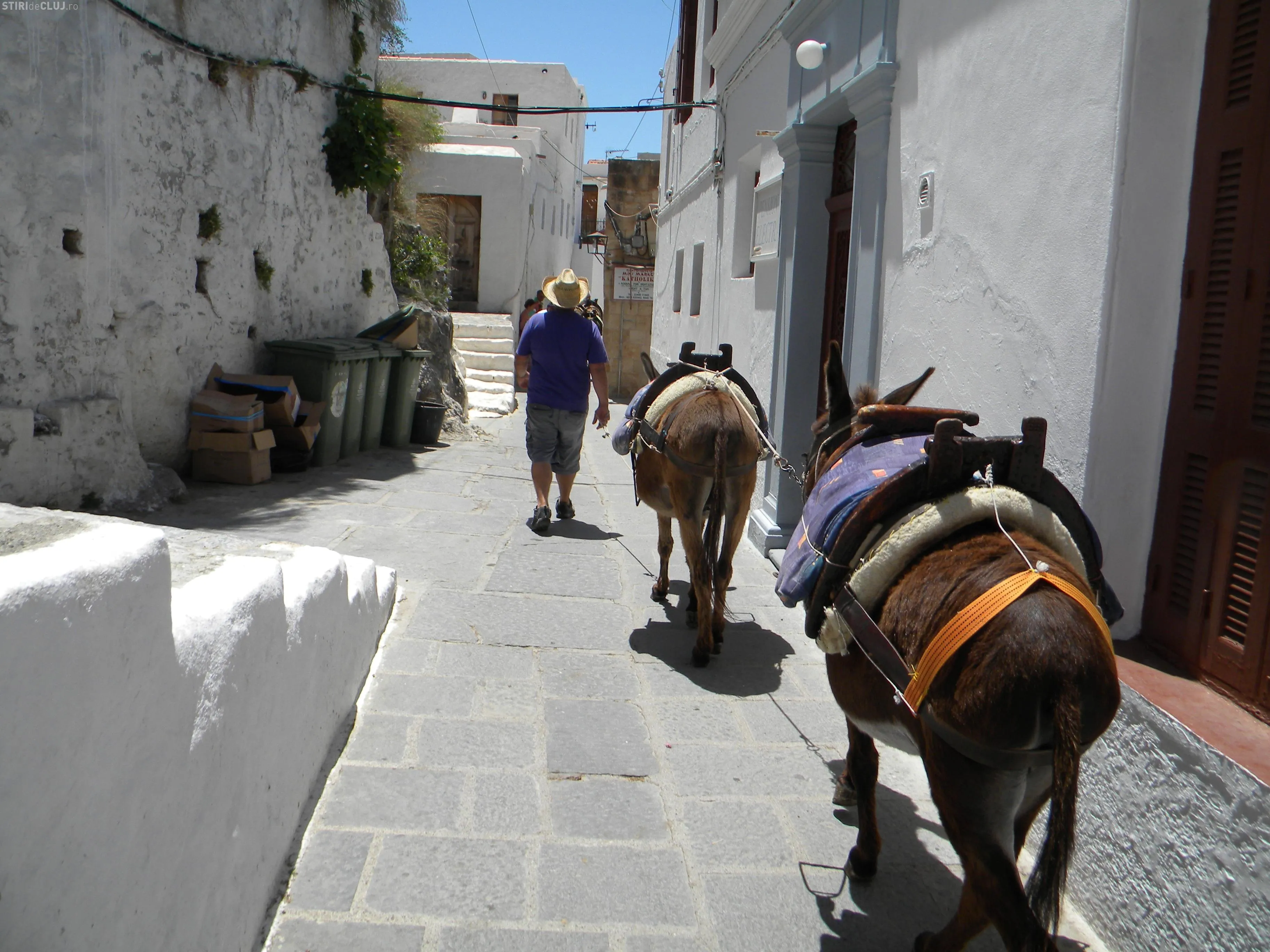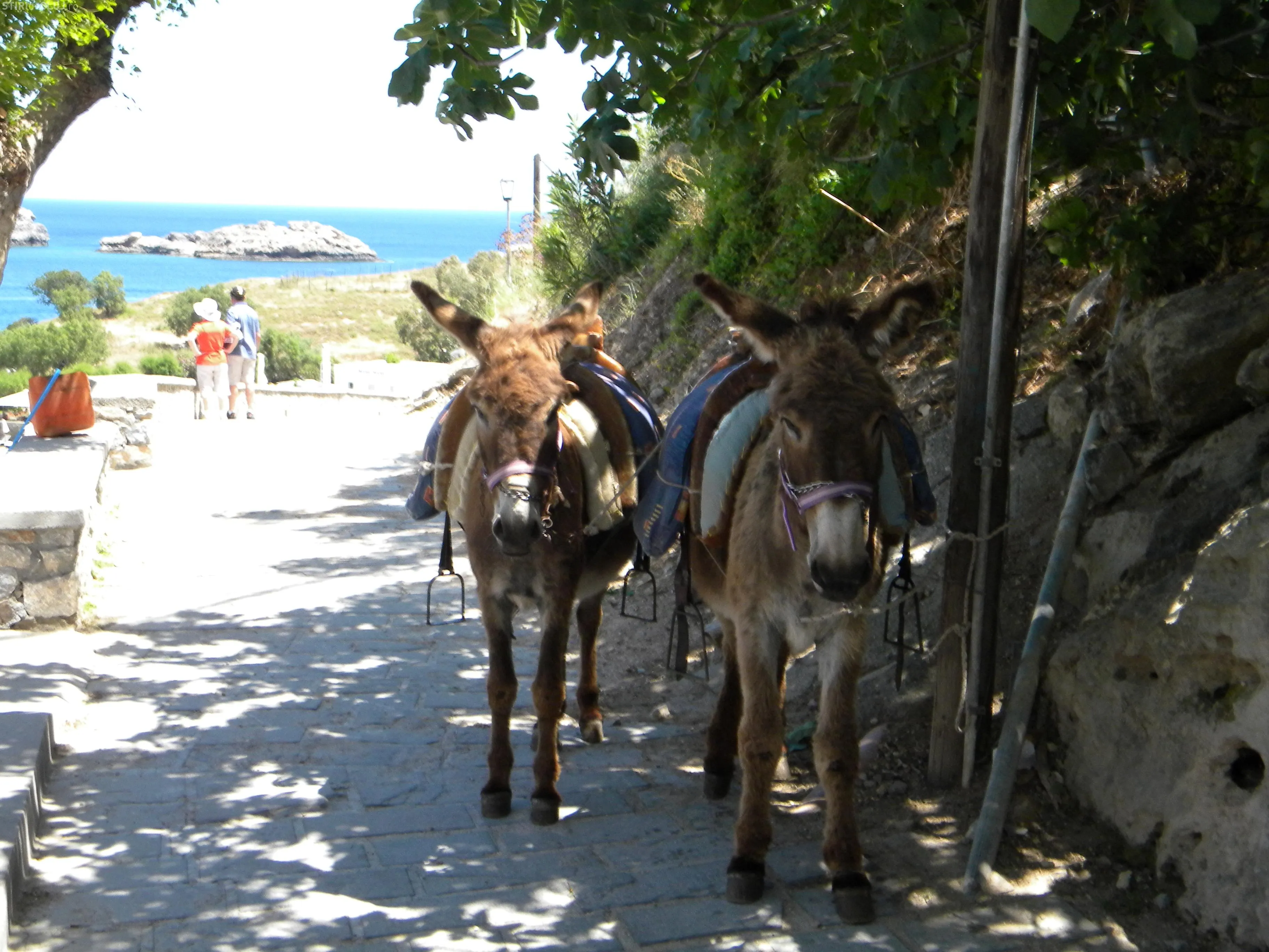 Drumul din micuțul port din Lindos urcă până la mărețul Acropolis, construit pe cea mai înaltă stâncă. Până acolo turiștii pot închiria măgăruși, pe care pot colinda străduțele satului. Trebuie să ai o anumită raportare la animale pentru a le încăleca și a te lăsa purtat prin micul sat Lindos. Eu, sincer, nu am putut să fac așa ceva, fiindu-mi prea milă de bietele animale. Mai milă mi s-a făcut când am văzut ”garajul” cu măgăruși de pe o stradă din Lindos.