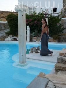 In prima dintre poze, Carmen este pe marginea unei piscine, iar feminitatea ii este pusa in valoare de rochia cu spatele gol. Poza pare dintr-un film despe Grecia Antica, datorita coloanelor si modului in care este facuta piscina. La tablou contribuie si rochia fluida a prezentatoarei si sandalele ei fara toc.