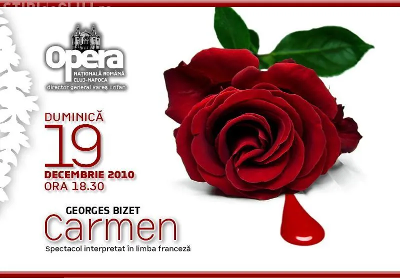 Spectacolul Carmen, de Bizet, va fi jucat duminica, 19 decembrie, de la ora 18.30, la Opera Nationala din Cluj.Spectacol este interpretat in limba franceza.
