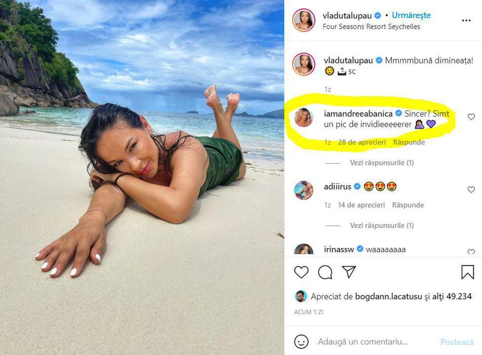 Fotografiile postate de vedetă în mediul online au stârnit reacții din partea fanilor artistei, însă cea care a uimit pe toată lumea a fost Andreea Bănică. Celebra cântăreața a lăsat un comentariu în dreptul unei imagini cu Vlăduța Lupău pe o plajă din insula Seychelles. Artista a recunoscut că este invidioasă pe momentul de relaxare al colegei sale de breaslă.