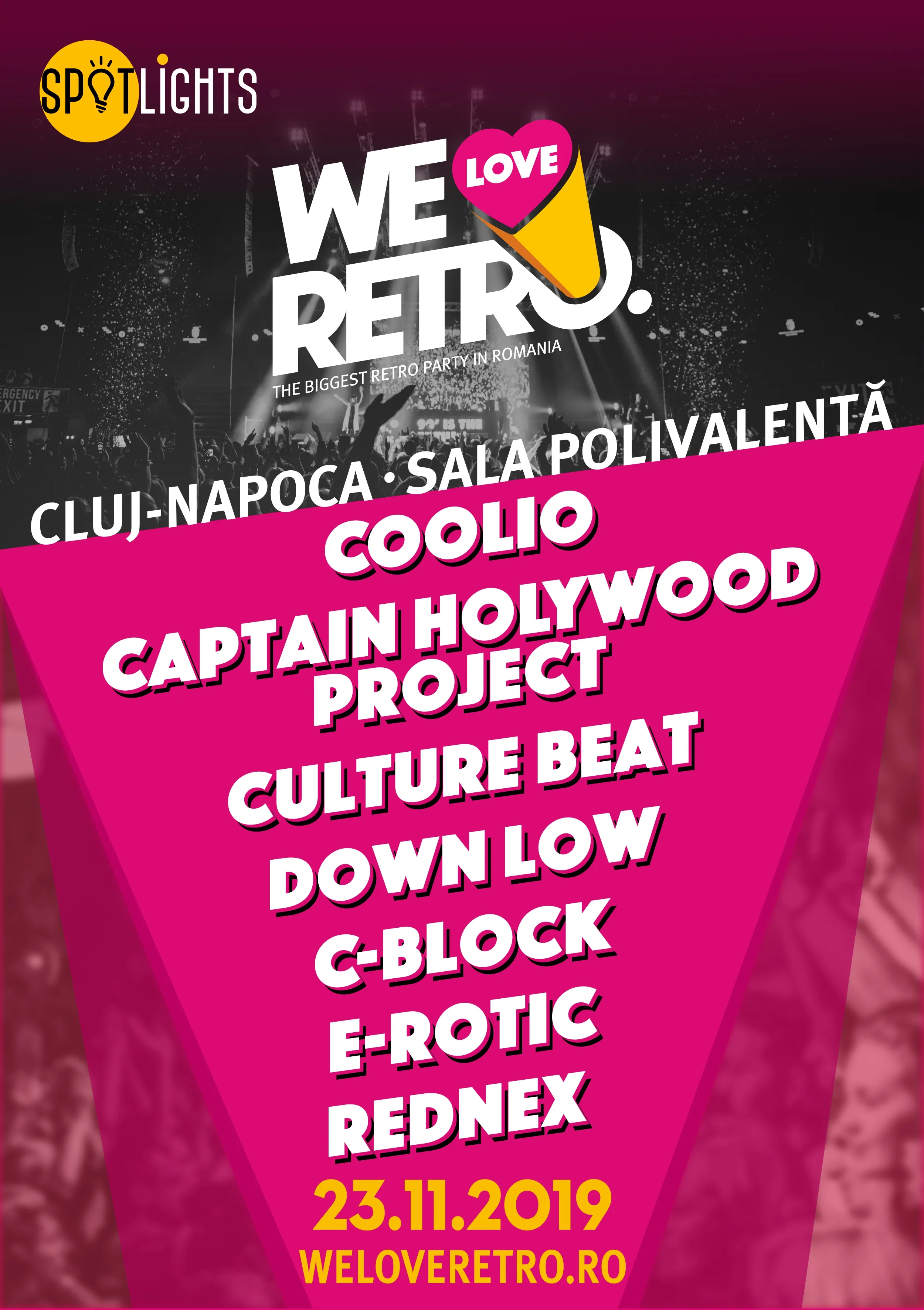Cel mai mare eveniment de muzică retro din România,WE LOVE RETRO, revine la Cluj Napoca pe data de 23 noiembrie 2019, la Sala Polivalentă. De 6 ani Sala Polivalentă găzduiește cel mai mare retro party, iar anul acesta faniilor We love retro , li s-a pregatit o noua surpriza: mai multi artisti , mai exact 7 dintre cei mai mari artiști ai anilor 90 vor urca pe scena din Cluj.