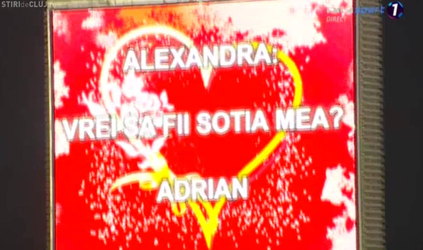 Pe tabela de marcaj a apărut mesajul ”Alexandra vrei să fii soția mea? Adrian”” pe fundal roșu și o inima.