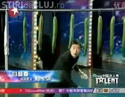 Barbatul a legat mai multi castraveti si i-a taiat cu carti de joc. Chinezul sustine ca s-a antrenat de la 6 ani pentru aceasta proba.