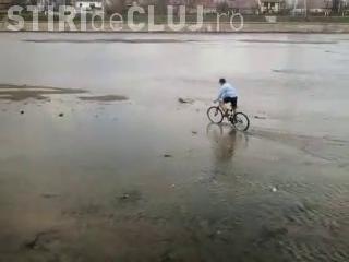 Scena este filmata de mai multi prieteni ai "ciclistului acvatic", care l-au incurajat de pe margine. Tanarul a intrat in Somes pe scarile din zona Salii Sporturilor si a pedalat prin apa cateva sute de metri.