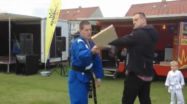 Antrenorul a încercat să spargă o bucată de lemn cu pumnul, însă nu a reușit și după o serie lungă de încercări a trecut la lovitura de pizior, tot fără succes. Într-un final a reușit să ”dovedească” bucata de lemn însă a lovit o fetiță în cap în proces.