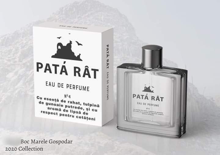 „PATÁ RÂT, eau de perfume. Cu esență de rahat, tulpină de gunoaie putrede și cu aromă de lipsă de respect pentru cetățeni”, se arată pe cutia parfumului de 5 stele, care a apărut în mediul online.